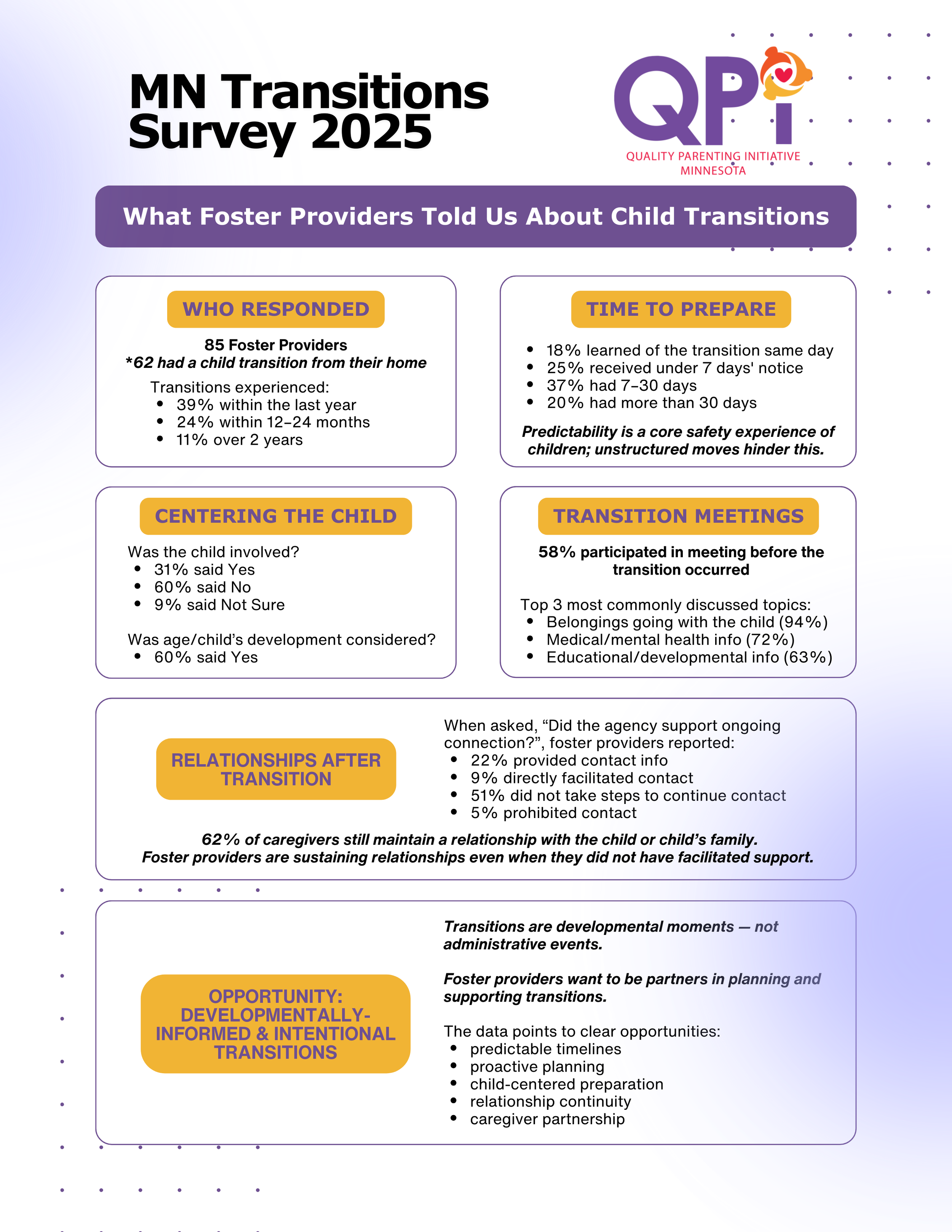 Data collected from our Quality Parenting Outreach (QPO) work to help centers lived experience voices in practice and policy discussions.