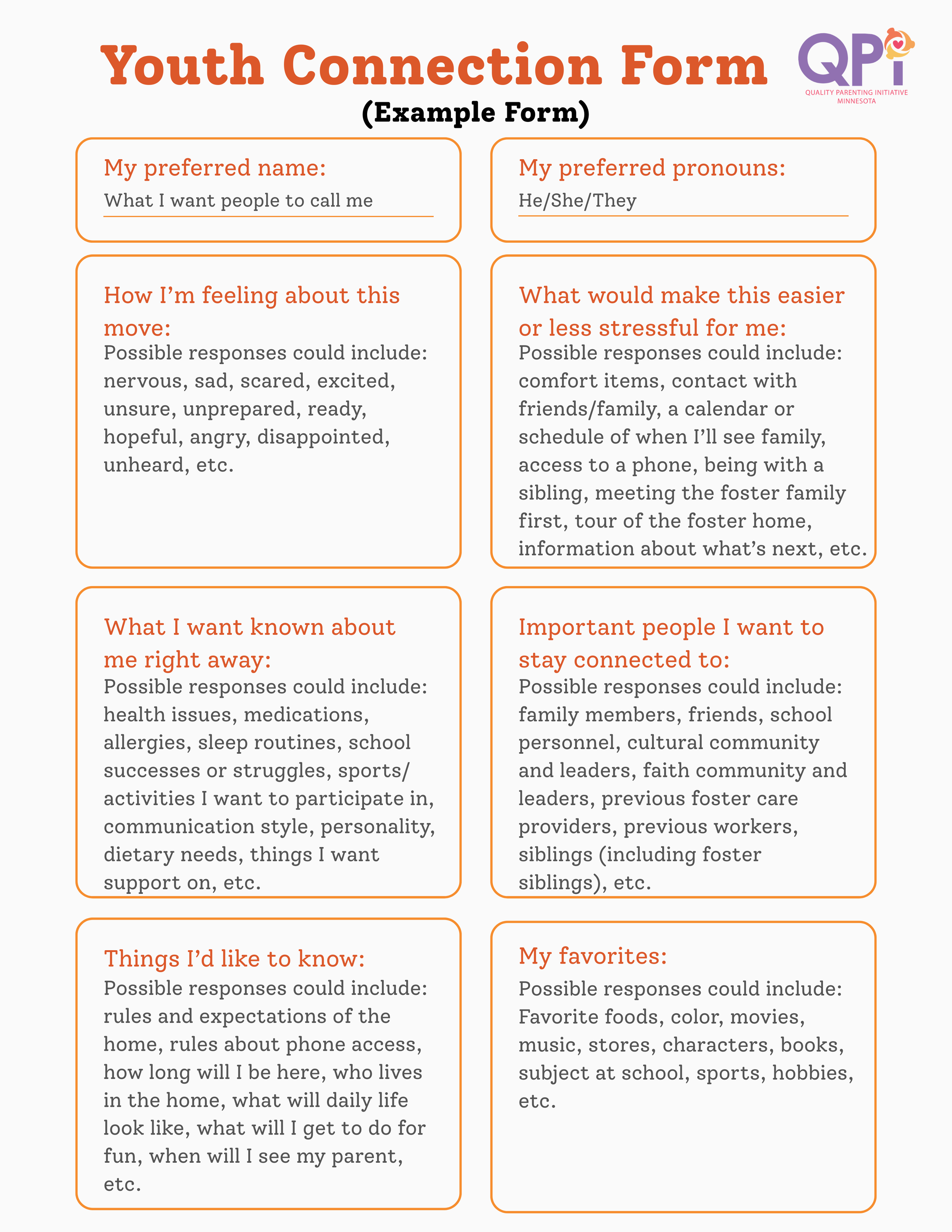 When a youth is preparing for a move, we have the opportunity to respect their relationships and help them feel seen. This form is one tool to help caregivers and professionals understand what matters most during this transition. Itβs voluntary and should be completed only if the youth wants to.